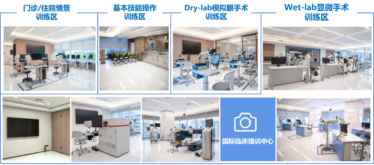 AICTC設(shè)置了“門診/住院情景訓(xùn)練區(qū)”、“基本技能操作訓(xùn)練區(qū)”、“Dry-lab模擬眼手術(shù)訓(xùn)練區(qū)”、“Wet-lab顯微手術(shù)訓(xùn)練區(qū)”四個(gè)培訓(xùn)功能區(qū)共8個(gè)lab,可實(shí)現(xiàn)以超聲乳化、飛秒白內(nèi)障、玻璃體切除、準(zhǔn)分子激光、全飛秒、ICL、角膜移植等眼科亞??剖中g(shù)培訓(xùn)為核心,以眼科基本檢查與技能訓(xùn)練為輔的全方位教學(xué)。