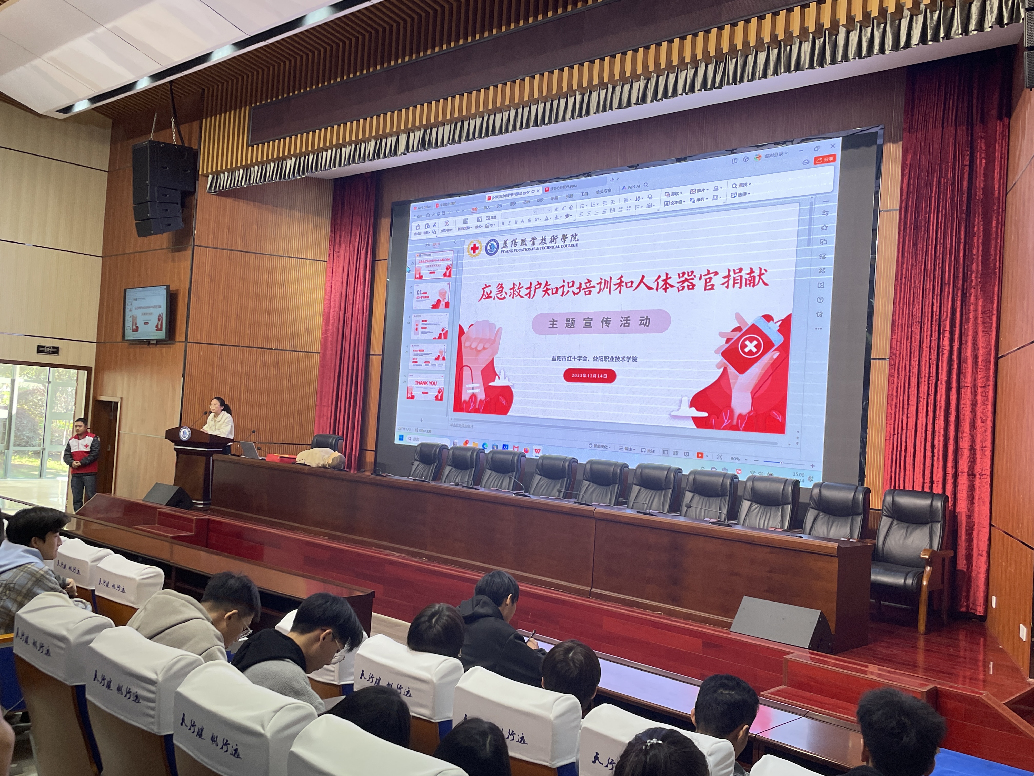 為進(jìn)一步弘揚(yáng)“人道、博愛、奉獻(xiàn)”的紅十字精神,提升學(xué)校師生自救互救技能,加強(qiáng)高校師生對(duì)器官捐獻(xiàn)知識(shí)的了解,在全社會(huì)營(yíng)造“自愿無償,高尚利他”的器官捐獻(xiàn)良好氛圍。2023年11月14日下午,益陽市紅十字會(huì)攜手角膜捐獻(xiàn)愛爾眼科接收登記站(益陽愛爾眼科醫(yī)院)在益陽職業(yè)技術(shù)學(xué)院,開展了應(yīng)急救護(hù)知識(shí)培訓(xùn)及人體器官捐獻(xiàn)主題宣傳活動(dòng)。當(dāng)日,益陽職業(yè)技術(shù)學(xué)院逾400名師生參加宣傳活動(dòng)。